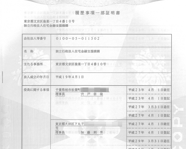 上の宍戸理事長さんは、平成23年4月1日~平成27年3月31日まで、住宅金融支援機構の理事長を務められていたので、その間に理事長宍戸さん名で発行された、抵当権抹消登記に関する書類は、現在も使えるってことです。