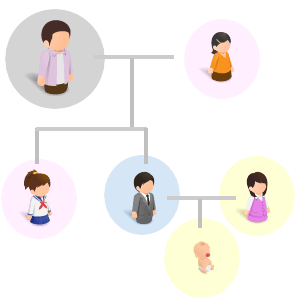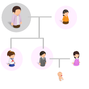 真ん中のお父さん(グレーの丸い背景)が亡くなった場合には、奥さんと子供2名(ピンクの背景)が相続人になります。